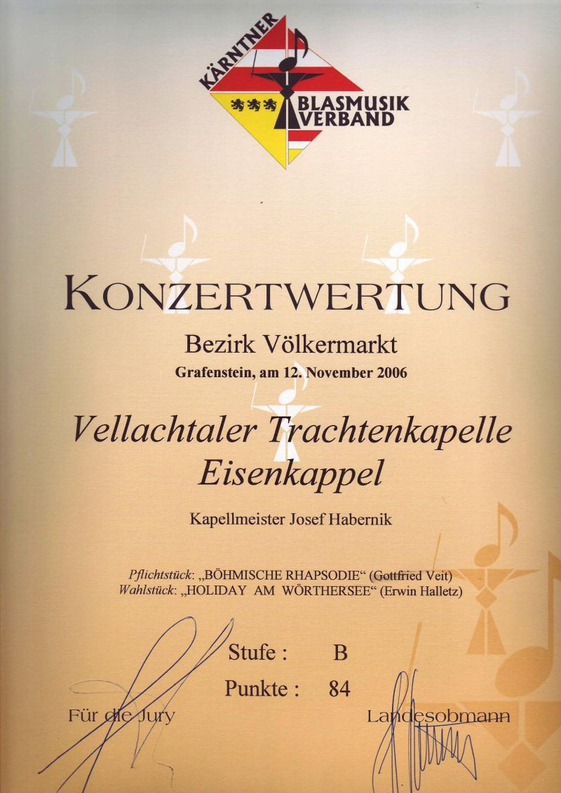 Am 12. November 2006 stellte sich die Vellachtaler Trachtenkapelle beim Bezirks-Konzertwertungsspiel in Grafenstein der fachkundigen Jury.