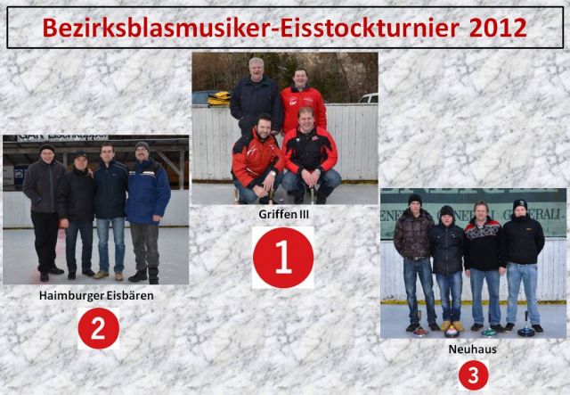 15 Moarschaften aus den Musikkapellen des Bezirkes Völkermarkt stellten sich am Samstag, 7. Jänner 2012 beim Bezirksmusiker-Eisstockturnier nicht mit Pauken und Trompeten, sondern mit Eisstöcken und Dauben einem spannenden Wettkampf - und das auch noch auf glattem Boden.