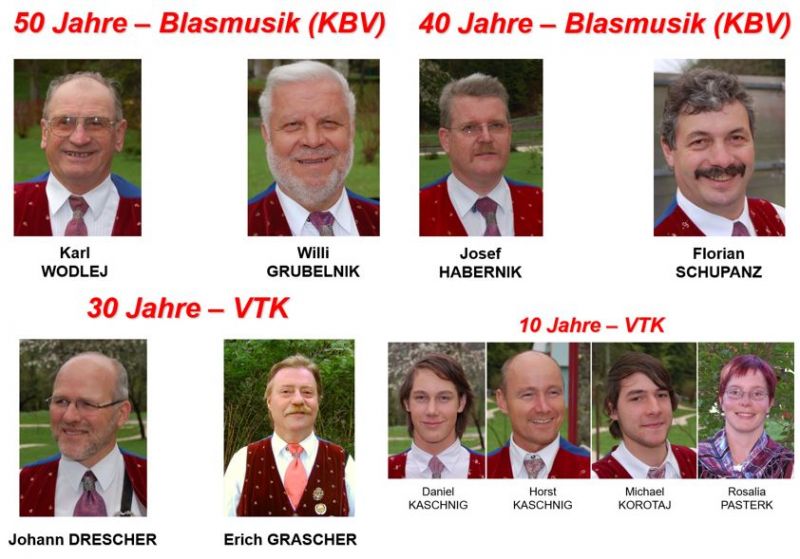 Bei der Mitgliederversammlung am 30. Jänner 2011 wurden Willi GRUBELNIK und Karl WODLEJ für 50jährige Blasmusikmitgliedschaft vom KBV-Bezirksobmann Herbert Tschürtz und Bürgermeister Franz Josef Smrtnik geehrt.