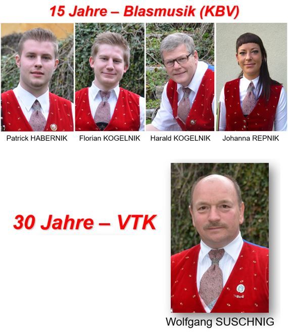 Damijan GARTNAR, Erich GRASCHER, Arthur PUTZER und Bernd VEJNIK wurden für 10jährige Treue und Daniel KASCHNIG für 15jährige Treue zur Blasmusik geehrt.